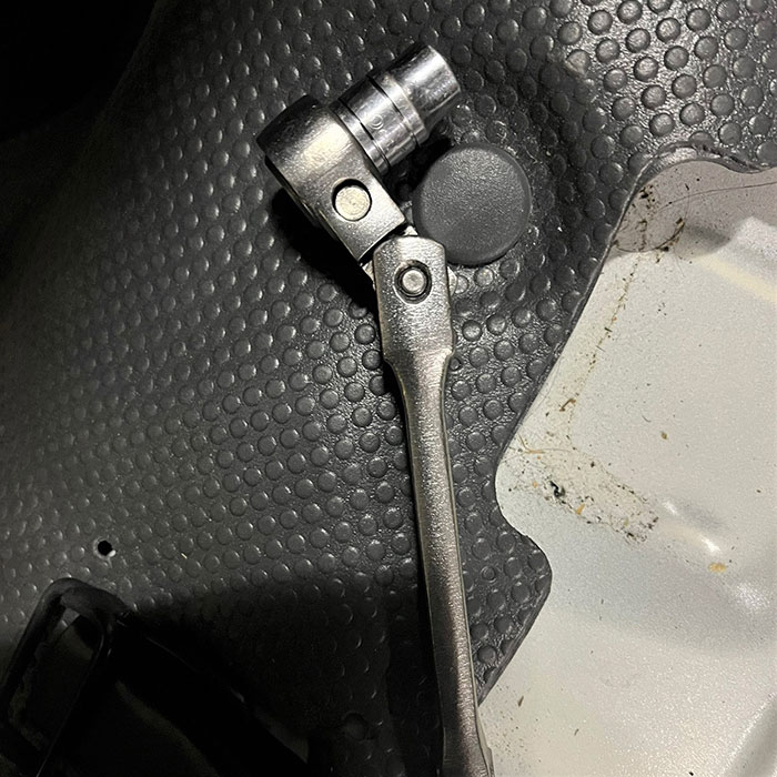 バッテリー固定ステーは10mmナットで留まっているので、ラチェット+10mmボックスを反時計回りに回して緩めます。