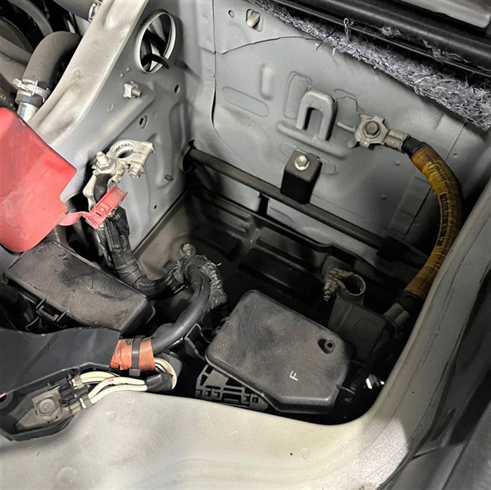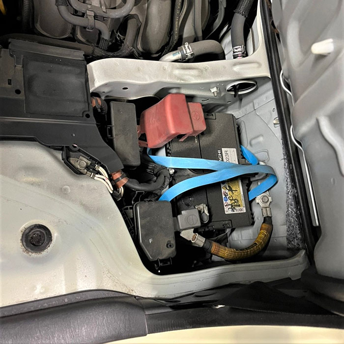 平成26年式 トヨタ ハイエース(CBF-TRH200V)のバッテリー交換は、助手席シート下のエンジンルームにあるバッテリーをラチェット10mmで固定ステーと端子を外し、新しいバッテリーを載せるだけで完了します。
