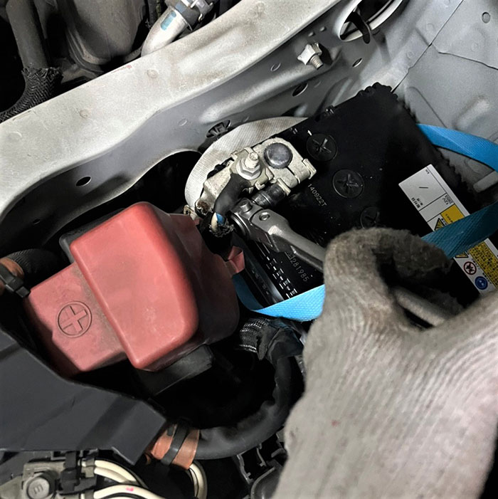 必ずマイナス端子(-)→プラス端子(+)の順番で緩め、ケーブルを横にずらしておきます。