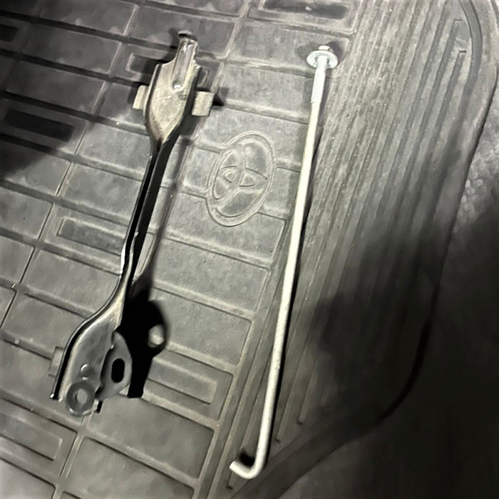 助手席シートを跳ね上げるために、シート前方のフックを2箇所外します。