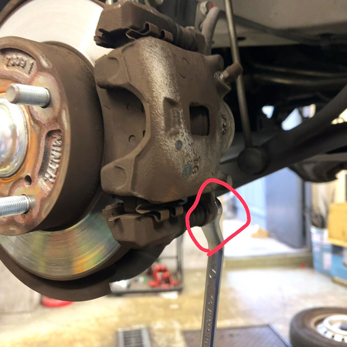 次に、ブレーキキャリパーを固定している14mmのボルトをメガネレンチで反時計回りに回して外してください。