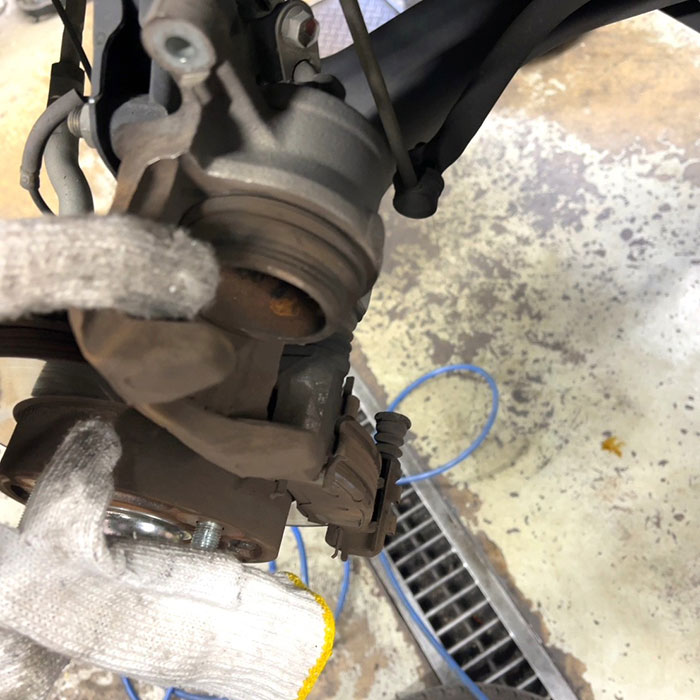 キャリパーが外れたら、一時的にワイヤーやフックでボディに吊っておくとホースへの負荷を減らせます。
