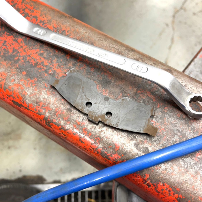 キャリパーを跳ね上げれば、ブレーキパッドが簡単に取り外せる状態になります。