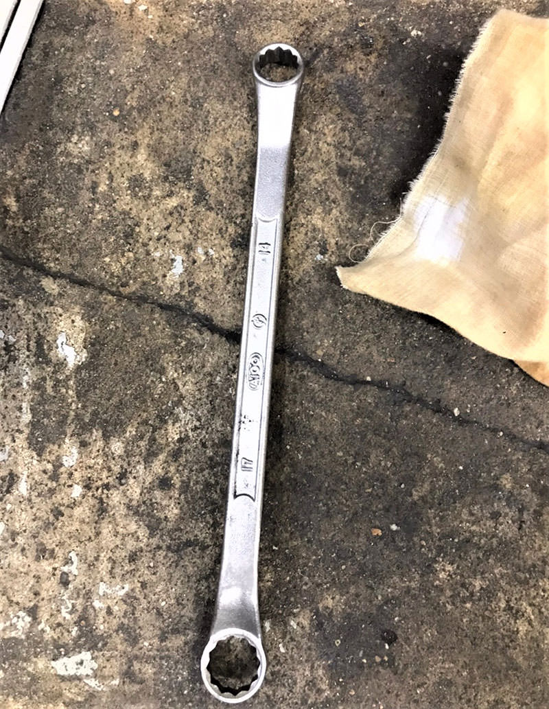 ドレインコックが見つかったら、14mmメガネレンチを当てて反時計回りに回します。