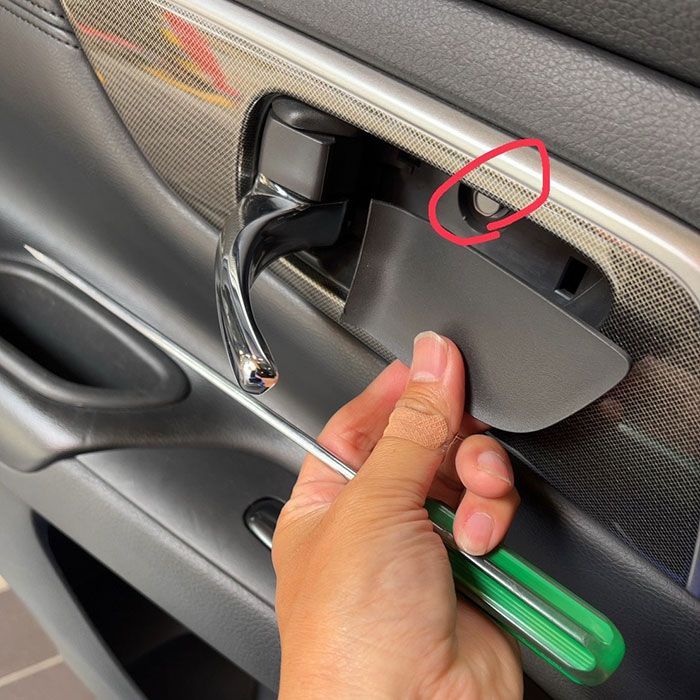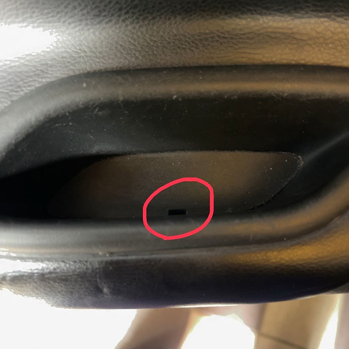 最初に、写真2枚目の赤丸部分(ドアハンドル付近)に隠しネジが2つ存在します。