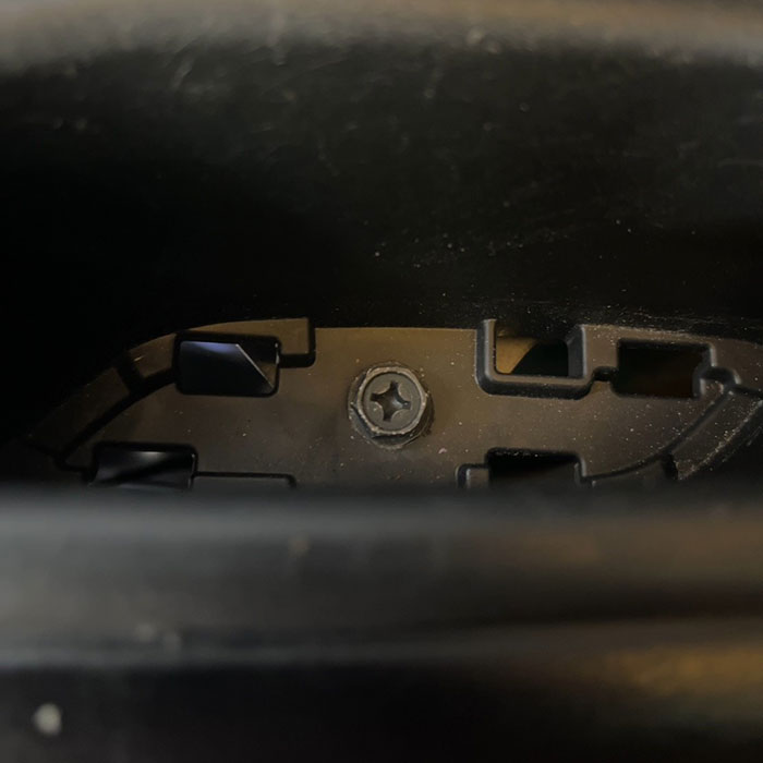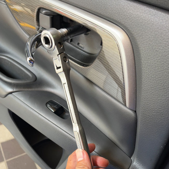 - 2つ目のネジ:ドアポケット(写真5枚目)にある小さなフタをこじ開けて取り外し、中のネジをラチェット+10mmボックスで緩める。
