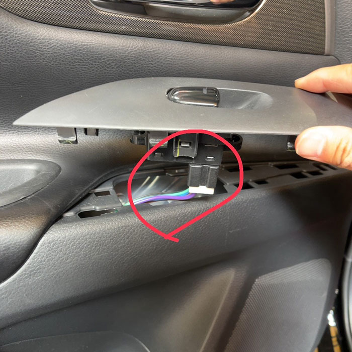 上記のネジを外したら、ドアスイッチパネルやドアハンドル周りのパーツを外し、内部のカップラーを抜きます。