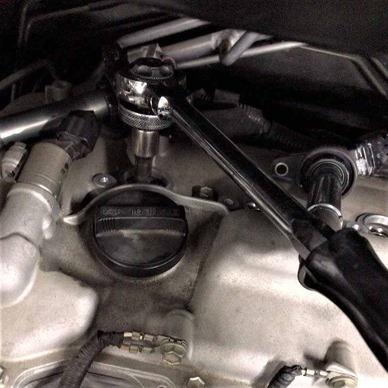 プラグ交換後は逆の手順で、イグニッションコイルをホールに差し込み、10mmボルトを時計回りで締めて固定します。
