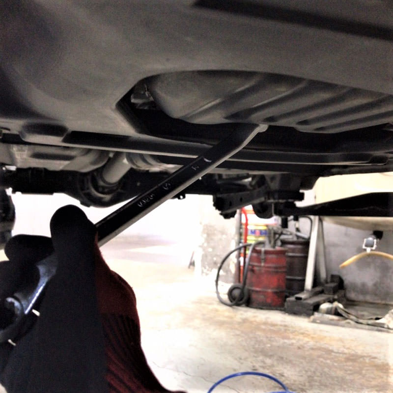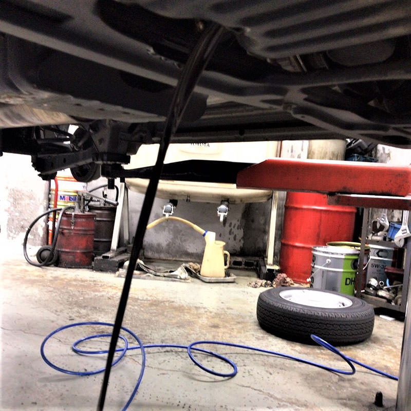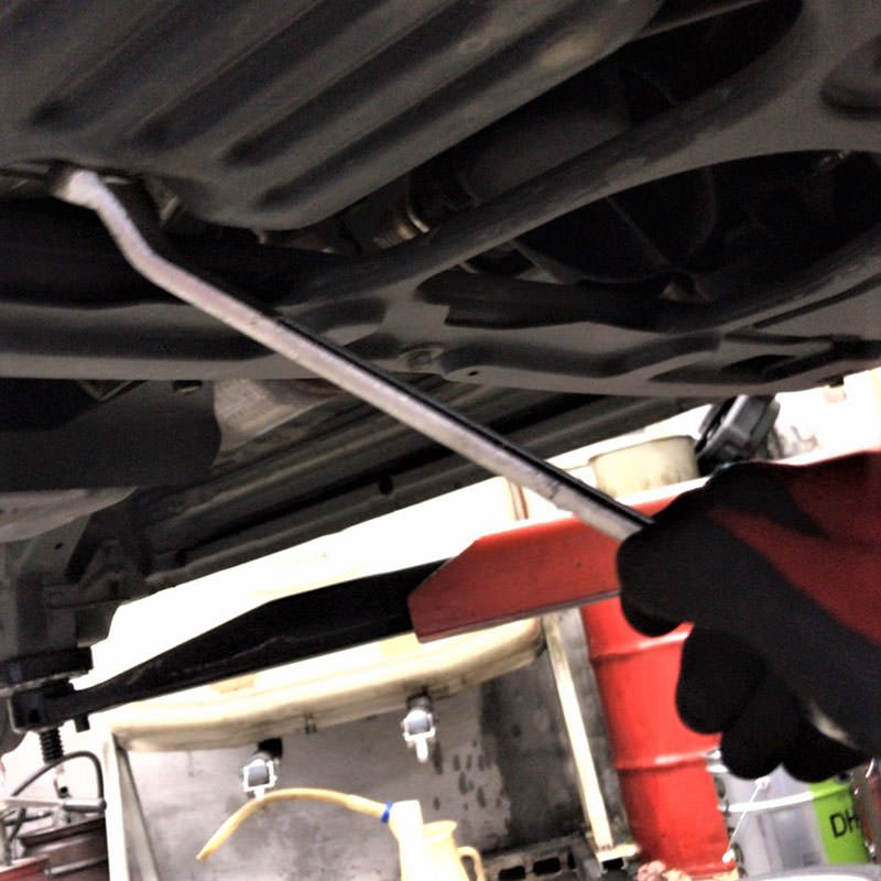 まずは車をリフトアップまたはジャッキとウマで安全に固定し、下回りへアクセスできるようにします。